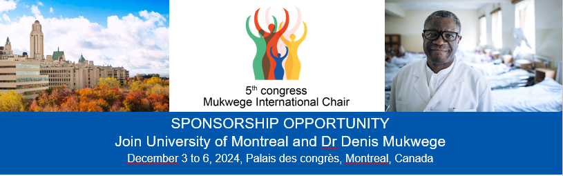 The 5th congress Mukwege International Chair is a unique opportunity to exposure to an audience of over 400 participants, including Dr. Denis Mukwege, 2018 Nobel Peace Prize winner, world-renowned speakers, government representatives, researchers and multidisciplinary and international organizations: universities, research groups, civil society organizations, NGOs and indigenous women's groups. Sponsorship of this major event will give you exposure in North America and internationally, and help support the costs of participation for representatives of the survivor movement, developing countries, civil society associations and students.